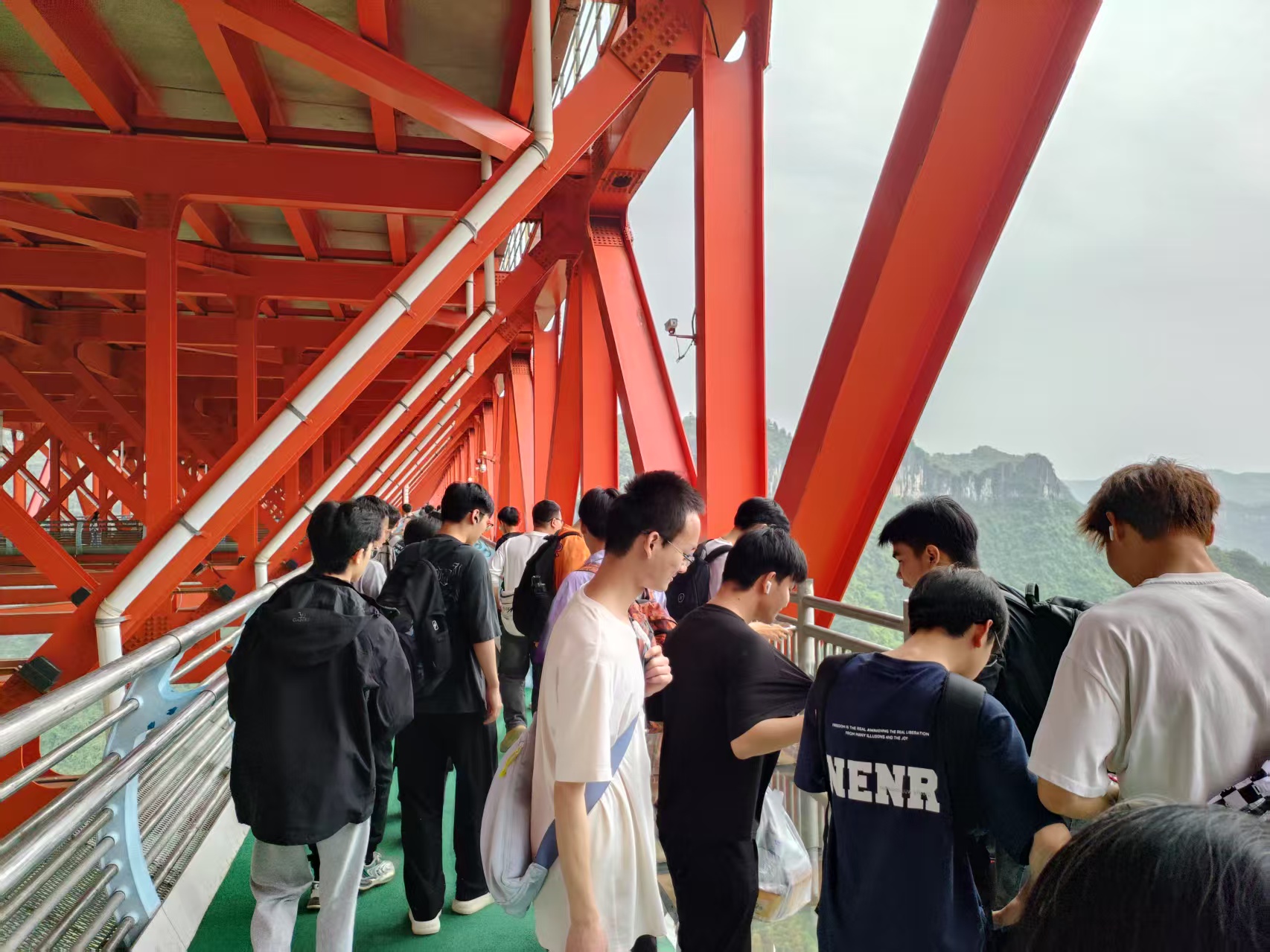 第三天,师生们来到了湘西矮寨特大悬索桥进行实地考察。湘西矮寨大桥,以其独特的塔梁分离式结构和创新的轨索滑移架设工艺闻名于世,被誉为世界桥梁工程的一大奇迹。该桥的设计和施工克服了多项世界级难题,创造了多个世界第一,包括主跨峡谷悬索桥长度1176米,首次采用塔、梁完全分离的结构设计方案,以及首次采用轨索滑移法架设钢桁梁施工。在老师们深入浅出的专业讲解下,同学们深入了解了桥梁结构受力、主缆施工以及抗震设计等关键技术细节,亲身体验了桥梁工程所蕴含的独特魅力,这极大地激发了他们对专业学习的浓厚兴趣。