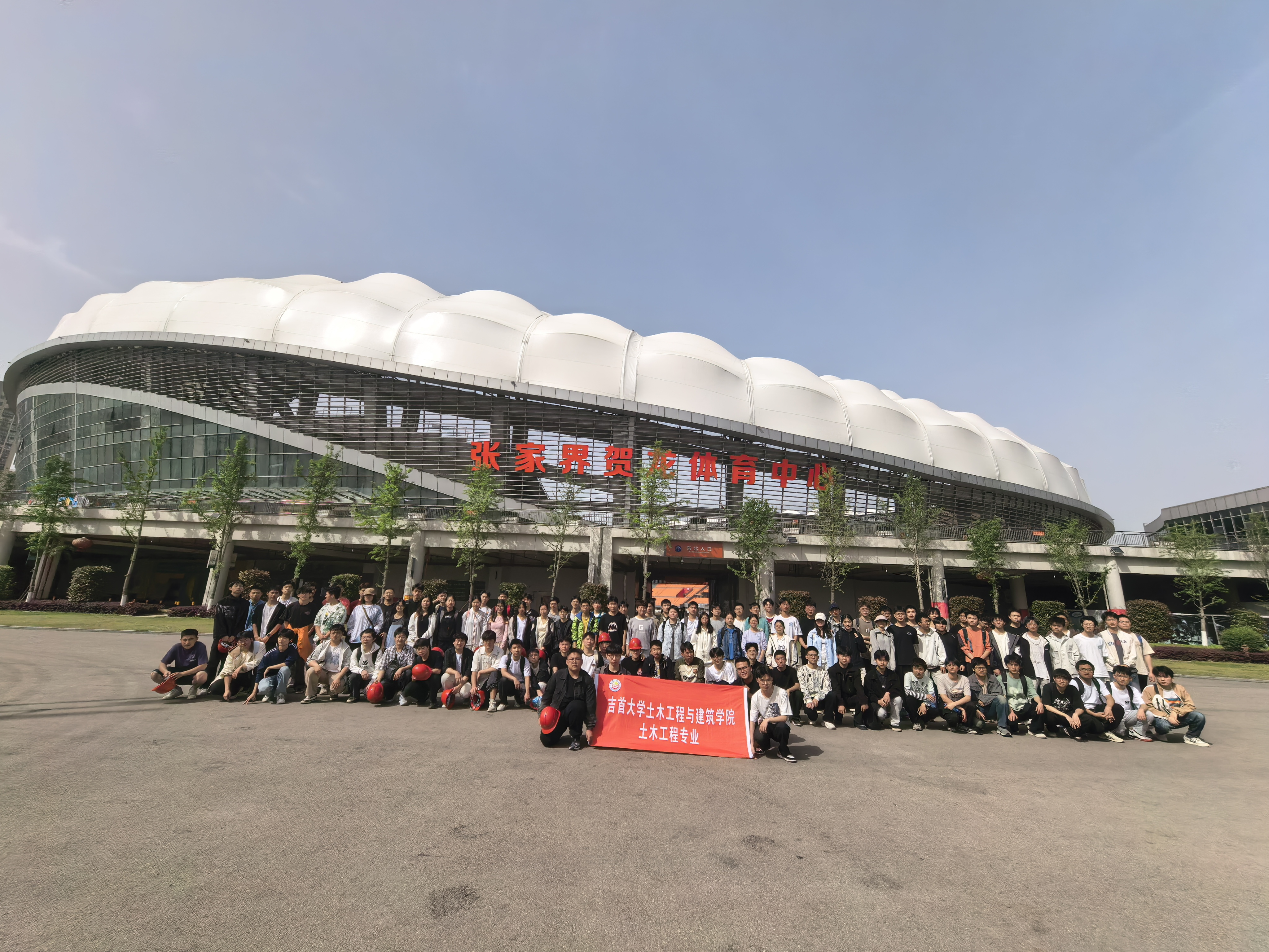 图为土木师生在贺龙体育馆外合影