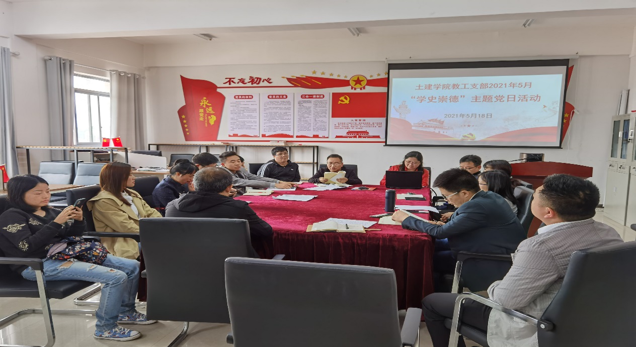 为了扎实推进主题党日活动,教工党支部年初制定了《2021年土木工程与建筑学院教工党支部主题党日活动方案》。按照方案要求,2021年5月18日15时,教工党支部在学院党员活动室如期开展了“学史崇德”主题党日活动。活动由党支部书记彭艳同志主持,副院长吴吉林同志、院党委副书记晏海清同志以及教工党支部全体党员参加了活动。