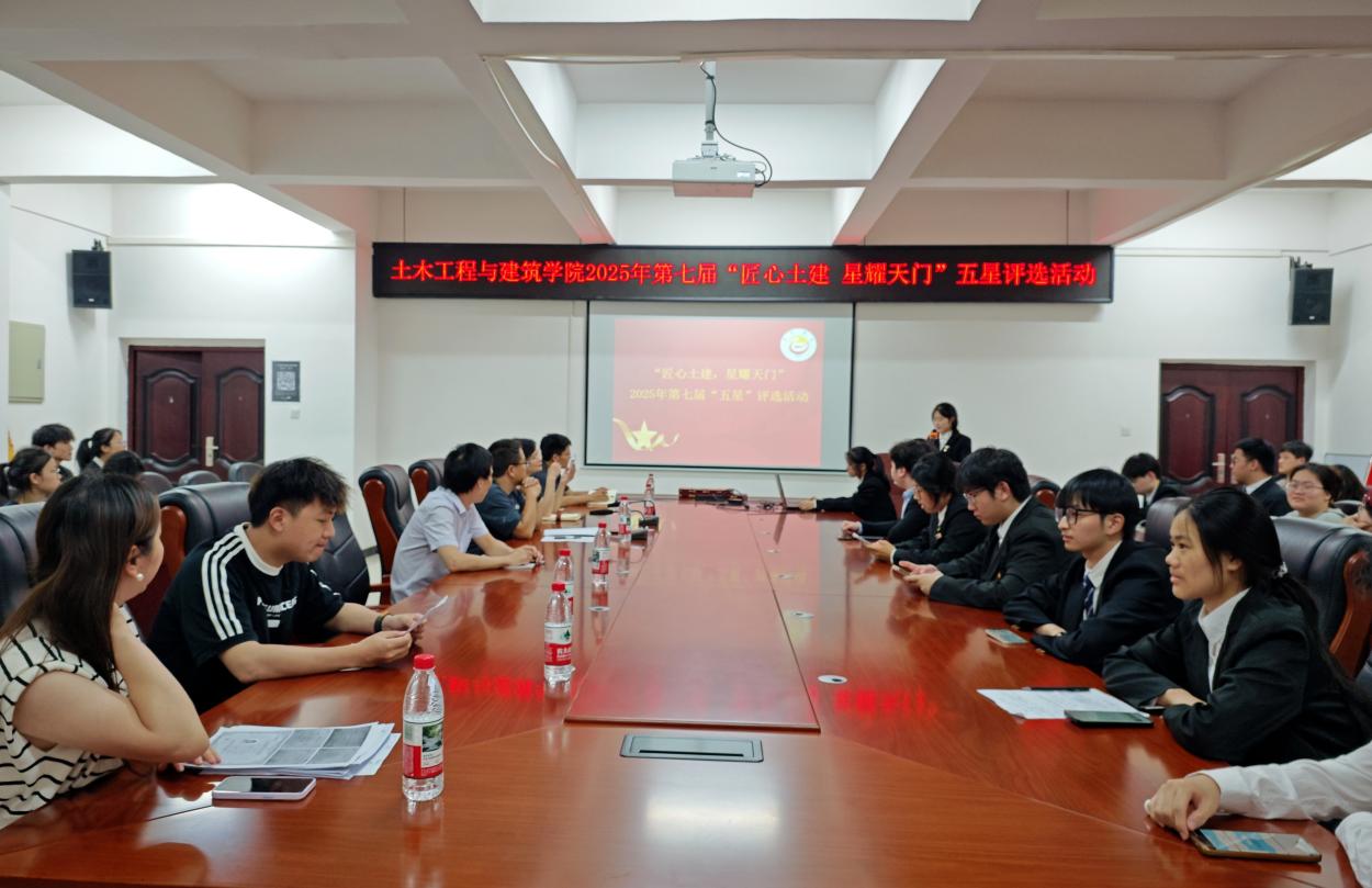2025年6月16日,学院2025年第七届“匠心土建 星耀天门”五星评选活动在第四教学楼六楼会议室顺利举行。院党委副书记钟洪波,副院长卓德兵,园林系主任孙青,规建系主任杨靖,学工办辅导员以及各班学生代表出席此次活动。