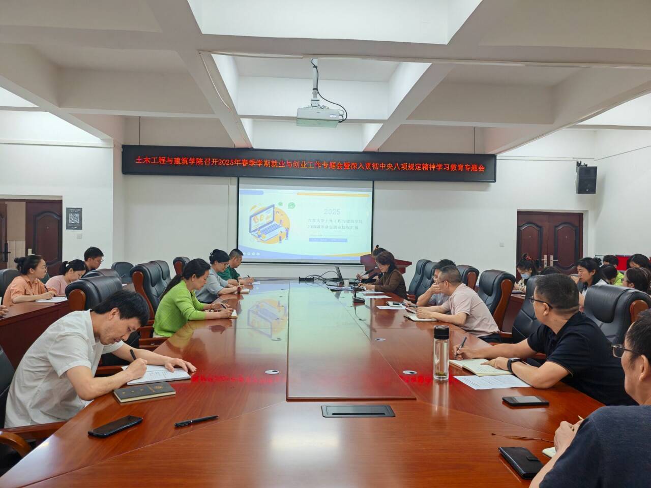 为深入贯彻落实党中央、国务院关于稳就业促发展的决策部署,分析当前就业形势,部署下一阶段就业工作重点任务,进一步推动学院毕业生高质量充分就业。5月26日下午,学院在第四教学楼会议室召开了2025年春季学期就业工作专题会。学院领导班子及全体教职工参加了会议。